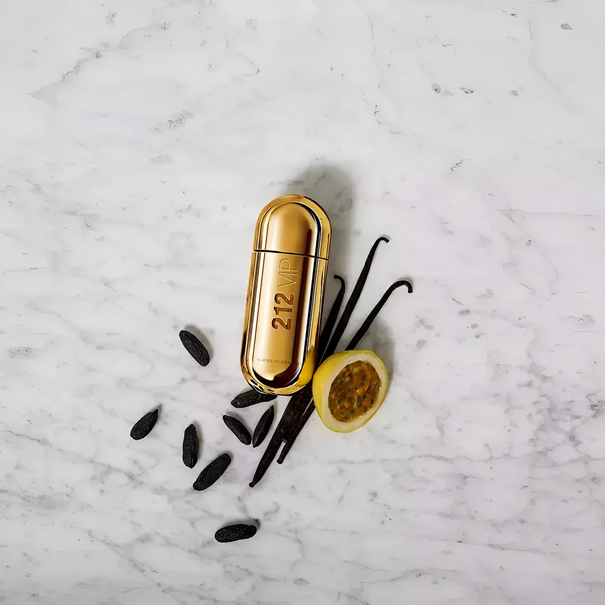 Carolina Herrera 212 VIP EDP smells like a luxurious blend of rum and passionfruit, enriched with warm vanilla and tonka bean, embodying youthful elegance and sophistication.