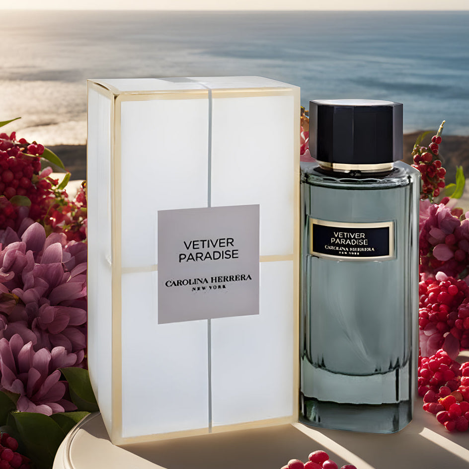 Carolina Herrera Vetiver Paradise EDT has a woody spicy scent, with top notes of bergamot, grapefruit, and pink pepper, and a heart note of nutmeg.