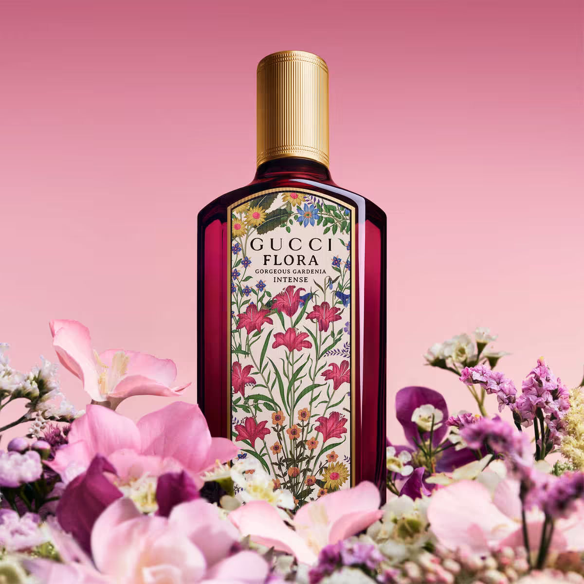 Gucci Flora Gorgeous Gardenia Intense EDP For Women is a luminous floral-woody gourmand with sparkling mandarin top notes, a creamy gardenia heart and warm sandalwood base, bottled in a fuchsia glass flacon with a glossy gold cap.