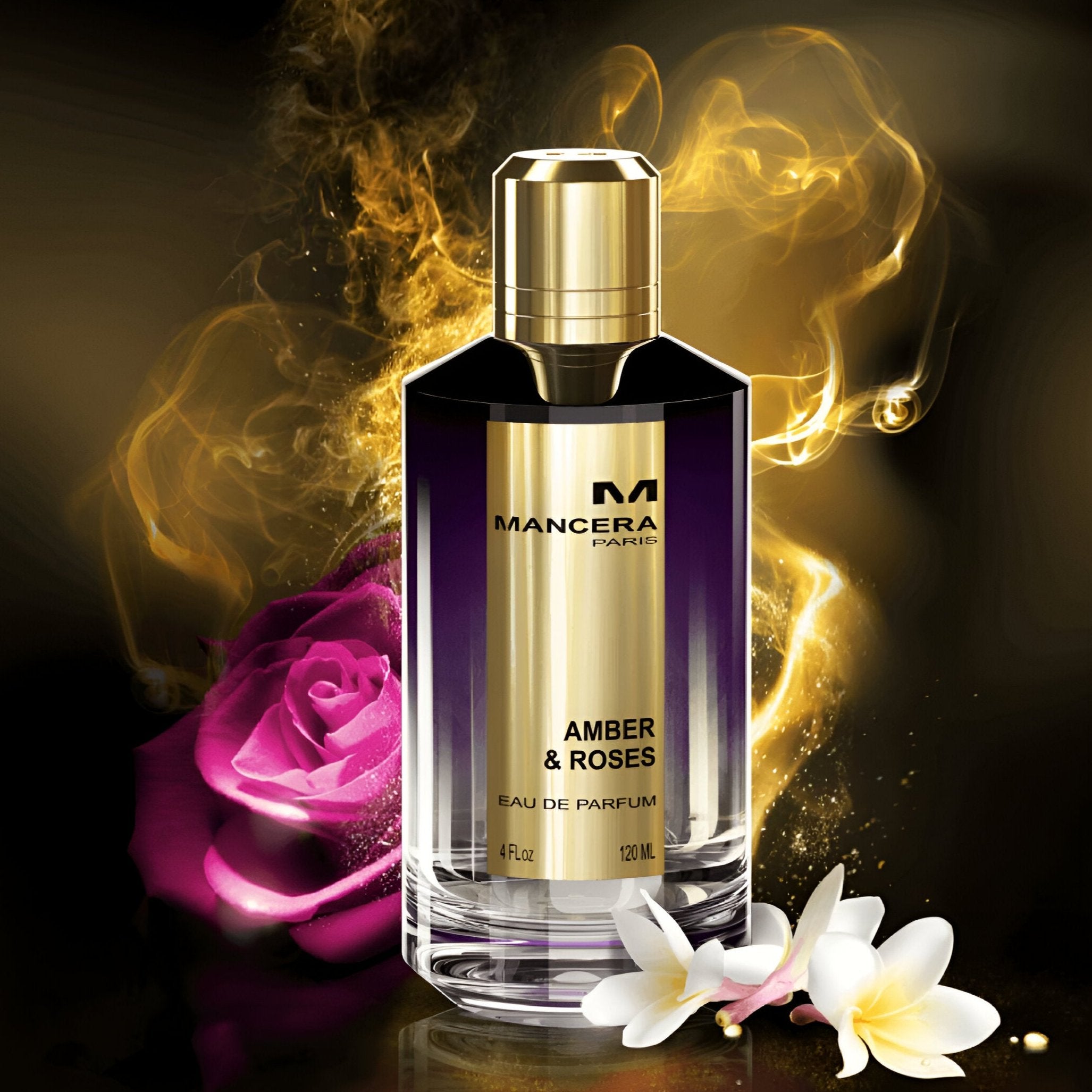 Amber & Roses by Mancera: a bold, sensual unisex fragrance launched in 2014, rich in resin, florals, and musk with luxurious gold and purple hues.