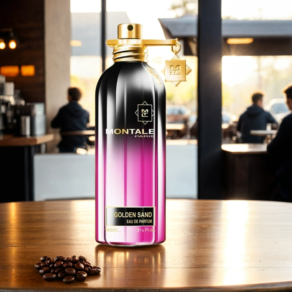 Montale Golden Sand EDP smells like a captivating blend of powdery rose and citrus, intertwined with warm spices, woody undertones, and a green, musky freshness, all anchored by a rich amber base.