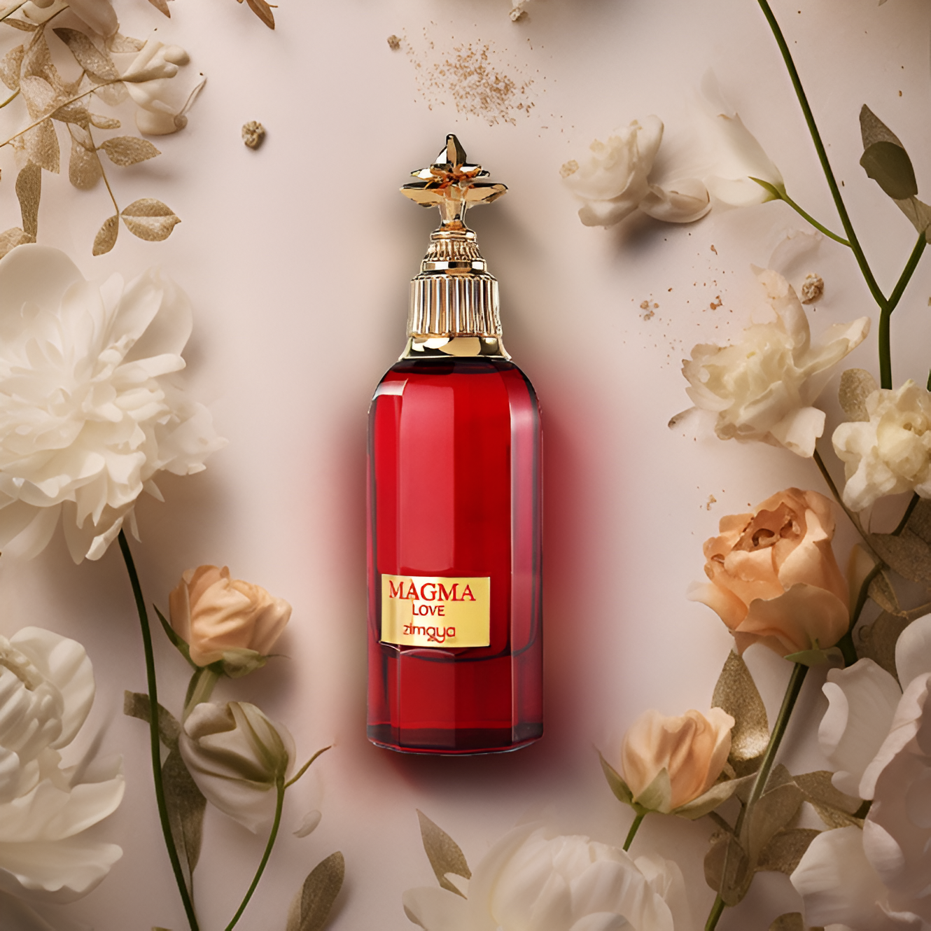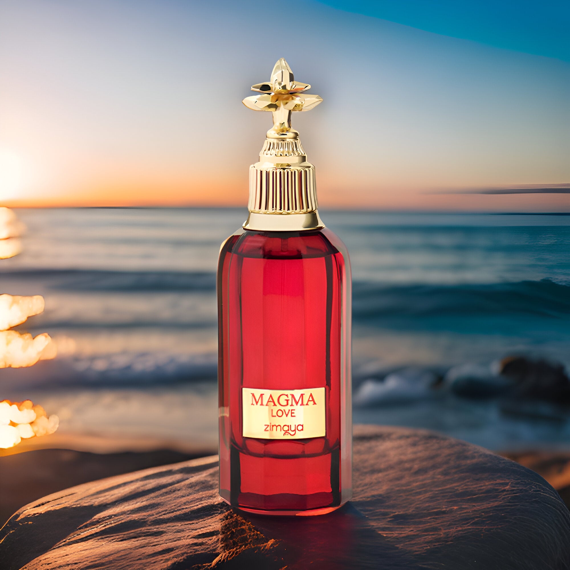 Zimaya Magma Love EDP smells like a captivating blend of juicy pear and zesty bergamot, a radiant bouquet of tuberose, orange blossom, and jasmine, all wrapped in the warm, lasting embrace of amberwood.